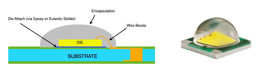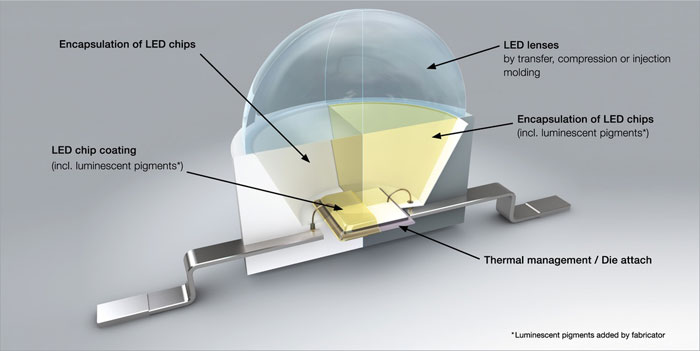 Ogni materiale ha un indice di rifrazione che determina il comportamento della luce quando lo attraversa (l’aria ha indice, n = 1, i materiali più “pesanti” hanno indice, n = 2, 3 o superiore). La condizione ideale per trasmettere la luce è quella di passare in un materiale, o “mezzo” (solido, liquido o gas), con indice simile o superiore. Se invece l’indice cala parte della luce viene riflessa e persa. Per questo motivo inizialmente come incapsulante si utilizzava un materiale epossidico, caratterizzato da un alto indice di rifrazione ma presto si è passato ai siliconi a basso indice poichè l’epossidico col tempo ingialliva per via dell’esposizione prolungata alle lunghezze d’onda inferiori ai 500 nm e riduceva drasticamente le prestazioni del LED.
